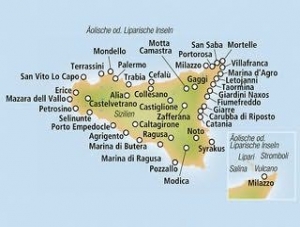 Sicilia, cea mai mare şi cea mai importantă insulă mediteraneană îşi datorează vechiul nume "tasselo" formei sale triunghiulare.Numele modern Sicilia derivă de la vechii locuitori "Siculi".Insula este o continuare a lanţului muntos Apenini şi Atlas. Cândva a fost legată de Calabria, Strâmtoarea Messina, care o desparte de Italia, este azi mai îngustă decât în timpurile de odinioară.Insula este o regiune muntoasă de la Nord la Est, cu un platou central, coborînd spre sud, până la câmpia fertilă de coastă. Etna, situat în Catania, cel mai mare vulcan din Europa, domină estul şi o parte din centrul Siciliei. Insula Sicilia este cunoscută datorită cutremurelor, vulcanilor noroioşi şi izvoarelor termale care se găsesc în multe locuri. Insula este impartita in 9 provincii: Agrigento, Catalnissetta, Catania, Enna, Messina, Palermo, Ragusa, Siracusa, Trapani. Provincia Agrigento se întinde de-a lungul coastei sudice a Siciliei, legată de restul insulei printr-o reţea de şosele şi cale ferată. Agrigento este renumit ca locul oraşului antic grecesc, Akragas. Aici se poate vizita: Valea Templelor, Muzeul Arheologic Regional, casa natala a lui Luigi Pirandello, etc. Provincia Catania este situată în partea estică a Siciliei, pe ţărmul Mării Ionice, cu provincia Messina la nord, provincia Enna şi Caltnissetta la vest, provincia Siracusa şi Ragusa la sud. Se pot vizita: amfiteatrul catanian, ruinele apeductului roman, forumul roman, basilica, catacombe, , termele achiliene, muzee etc. Clima: Clima | Ian. | Feb. | Mar. | Apr. | Mai | Iun. | Iul. | Aug. | Sept. | Oct. | Nov. | Dec. | Temperatura ziua | 13 | 14 | 15 | 18 | 22 | 26 | 29 | 29 | 26 | 22 | 18 | 15 | Temperatura noaptea | 5 | 5 | 6 | 9 | 12 | 16 | 18 | 18 | 16 | 12 | 8 | 5 | Temperatura apei | 14 | 14 | 14 | 16 | 19 | 23 | 24 | 24 | 23 | 21 | 19 | 16 |