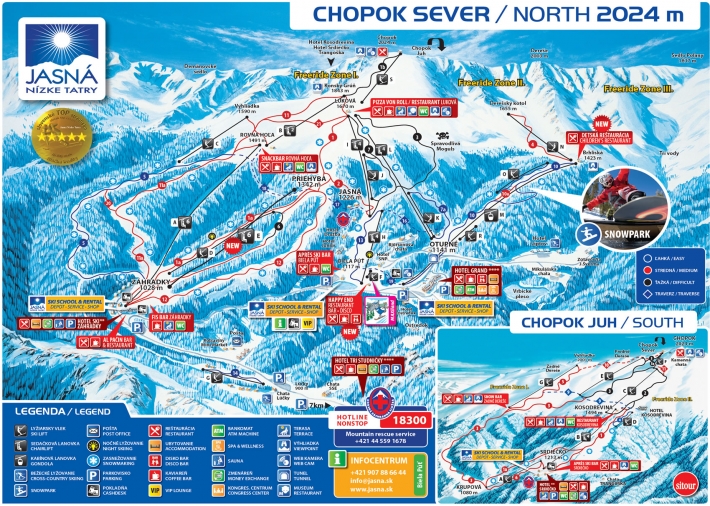 Informatii utile statiuni Statiunea Jasna se afla in valea Demanovska, parte integranta al Parcului National Tatra Josi, Incorporeaza 4 centre se schi: Chopok north Záhradky, Jasná, Otupné si Chopok south. Sezonul de schi dureaza in medie 120 de zile. Partiile, bine intretinute, ofera posibilitati atat pentru incepatori cat si pentru schiori experti. Se organizeaza de asemenea scoli de schi pentru adulti si pentru copii, exista schi service si centre de inchiriere de echipament sportiv. In cazul conditiilor de zapada nefavorabile, tunurile de zapada pot acoperi o suprafata de 10 ha. Statiile Zahradky, Biela Put faciliteaza legatura spre vf. Chopok iar din statia Otupne porneste telecabina spre vf. Derese. Telescaunul dintre statia Lukova si vf Chopok faciliteaza legatura spre versantul sudic al muntelui, imbogatind astfel paleta cu inca 5 partii, totalizand 7 km. Partii: lungimea totala a partiilor: 33 km (24 km Chopok Nord si 9 km Chopok Sud). Partii pentru incepatori(9 partii): aproximativ 38% din totalul de partii sunt albastre, cea mai lunga de acest tip fiind de 3500 m. Partii pentru intermediari(8 partii): cei mai multi km de partii sunt pentru cei cu nivel mediu (42% din totalul partiilor), iar cea mai lunga este de 3363 m. Partii pentru avansati(4 partii): 20% din partii sunt dificile, pentru cei mai experimentati schiori. Pe Chopok Nord sunt 3 zone de ski ce totalizeaza 24 km de partii: - Zahradky, cu o capacitate de 4900 pers/ ora, deservite de 2 telescaune si 4 teleskiuri. - Otupne, capacitate 4000 pers/ ora, cu 1 telecabina si 3 teleskiuri. . - Chopok-North, cu o capacitate de 2025 pers/ ora, cu 2 telescaune si 2 teleskiuri. Pe Chopok Sud sunt 2 telescaune si 4 teleskiuri, ce au o capacitate de 3990 pers/ ora. Printre facilităţile atractive oferite de pârtiile de schi se regăseste cea mai mare reţea de pârtii amenajată doar cu ratracuri, ceea ce ofera staţiunii o rezonanţă internaţională. Pentru a răspunde cererii turiştilor dornici să găsească zăpadă propice sporturilor de iarnă, 12 km de pârtie dispun de tunuri de zăpadă, iar pe o distanţă de 2 km schiorii se pot bucura de instalaţie nocturnă. Partiile se intind de la 900-2024 m altitudine si sunt conectate prin telescaune de până la şase persoane, 11 teleschiuri si o telecabină. Ski pass Jasna (preturi aproximative): 6 zile | Adulti | Seniori/ Juniori | Copii (6 - 12 ani) | Top Season | 178 | 142 | 125